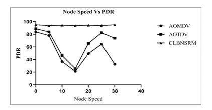 The Packet delivery ratio was corresponded with node speed and is shown in figure 7. The packet delivery ratio with reference to AOMDV and AOTDV shows dropping initially up to node speed 15 m/s and a gradual increase was noted up to 30m/s and thereafter again it was dropping. However, PDR of CLBNSRM has a quietly different scenario. The PDR is comparatively higher and there was no effect observed on PDR with the change in node speed. Precisely, one can say that PDR is significantly better and undisturbed with variation in the node speed.
