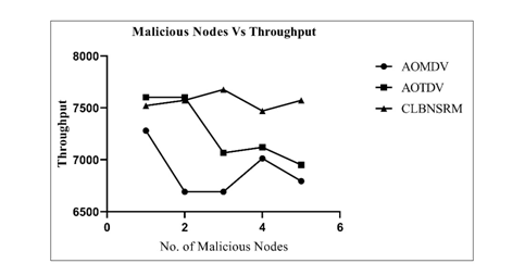 Throughput has also corresponded with variation in the number of malicious nodes and results are exhibited in figure 11. The Throughput of AOTDV and CLBNSRM was the same when the numbers of malicious nodes were less. But as the number of malicious nodes gets increased in the network, the throughput of AOTDV gets declined while in the case of CLBNSRM it was constant throughout the variation in the number of malicious nodes. On the other hand, the throughput of AOMDV was declined initially and later on it was increased.
