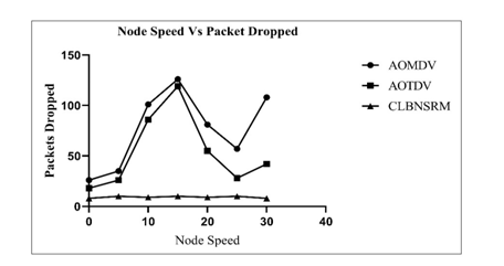 Packet dropped ratio was also corresponded to node speed (Figure 16). The results of packet dropped verses node speed indicated that AOMDV as well as AOTDV have maximum packet dropped at 15 m/s of node speed. In the case of both protocols, throughout all the node speed variation packet dropped was noticed. However, In the case of CLBNSRM packet dropout ratio was noticed minimum.