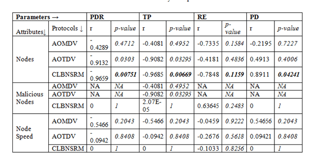 In the implemented protocol three different attributes were corresponded with the parameters Packet delivery ratio (PDR), Throughput (TP), Residual energy (RE) and Packet dropped (PD) for AOMDV, AOTDV and CLBNSRM. Since to check Statistical relation between attributes and parameters and also significance level was carried out.