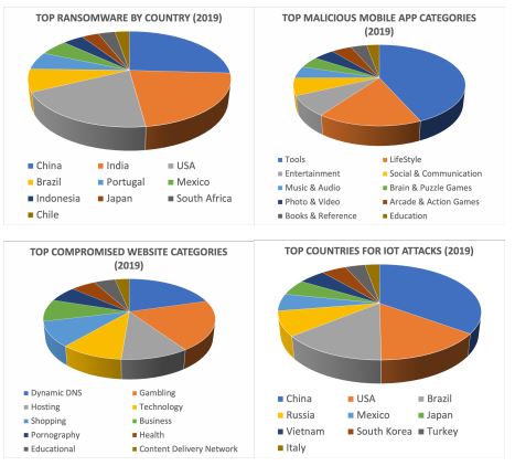 Figure 3. (a) Top ransomware by country (2019) (b) Top malicious mobile app categories (2019) (c) Top compromised website categories (2019) (d) Top countries for IoT attacks (2019) [5]