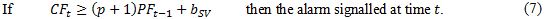 Applying the algorithm directly would yield a high number of false alarms. Thus, a simple modification is made to signal an alarm after a minimum number of consecutive violations of the threshold as shown in equation (3):
