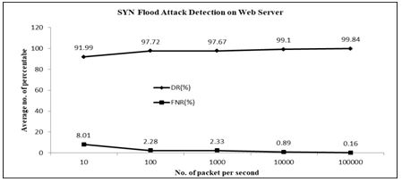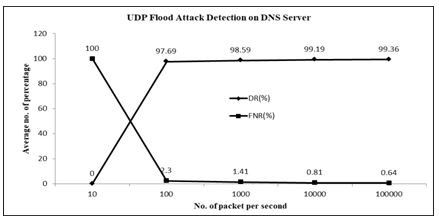 Depending on the rate of the attack, the percentage of the detection rate and false negative rate is different. As this system is implemented the flooding attack at the transport layer, the performance comparison of attack rate is described separately for TCP and UDP protocols. Web and DNS service is used to represent the TCP and UDP protocol, respectively. Five different rates of attack (i.e. 10 packets per second, 100 packets per second, 1000 packets per second, 10000 packets per second, and 10000 packets per second) are used to test the performance of the system. For testing each rate of attack, hping3 command is used with u100000, u10000, u1000, u100, u10 and u1 to send the attack packet with 10 packets per second, 100 packets second, 1,000 packets per second, 10,000 packets per second, and 100,000 packets per second, respectively. These results are produced by averaging the results of ten runs.