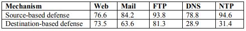 By reviewing the results of the percentage of attack packet that reaches the victim server, the source-based defense mechanism could reduce the attack packet up to 94.6% while the destination-based mechanism only reduce them to 31.4% for NTP service as listed in Table 7. Thus, the source-based defense mechanism is more effective than destination-based defense mechanism for the flooding attacks with non-spoofing IP address.