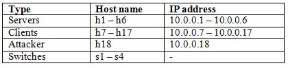 Step 2: After setting up the servers, all clients (from host h7 to h17) access all the servers concurrently for three minutes (18000 seconds). At the same time, we monitor the victim server by capturing all of its incoming and outgoing traffic with a packet capturing tool (i.e. tcpdump) [31].