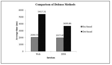 Since the former mechanism is dropping the attack packets nearest to the source of the attack, the network will not be congested with those attack packets.Thus, the source-based defense mechanism maintains higher performance than the destination-based defense mechanism. As shown in Figure 13, the latency of the source-based defense mechanism for each service is about doubling the latency of the destination-based defense mechanism.