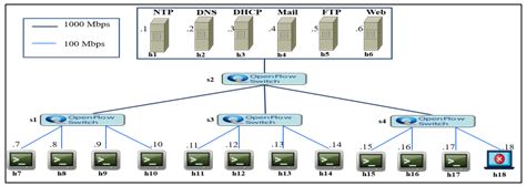 After defining the traffic generation format, firstly we setup the NTP, DHCP, DNS, SMTP, FTP, and Web server on the mininet host h1, h2, h3, h4, h5, and h6, respectively. Then, all client hosts except the attacker host h18 access the server concurrently according to the traffic generation format including specific IDT and PS for each service as shown in Table 4 and the packet generation rate as shown in Table 5.