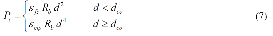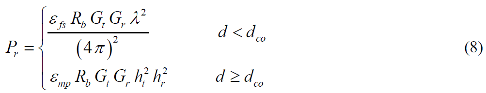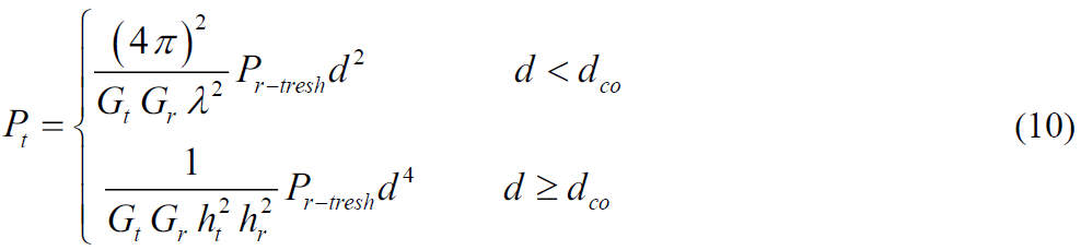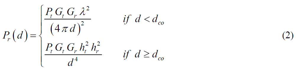 The transmission power is reduced when the distance is less than dco. Otherwise, if the distance is higher than dco, the two-ray ground propagation is used. The received signal power (Pr(d)) at distance d from the transmitter in free space (d< dco), and two-ray ground propagation (d≥ dco) is predicted by: