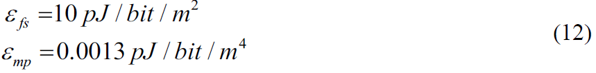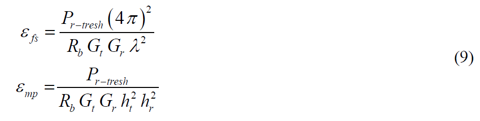 Hence, the received power must have a value not less than -52 dBm (or 6.3 nW) to ensure successful packet reception. By substituting the real parameter’s values of (9) (Gt = Gr = 1, ht = hr = 1.5 m, ⋋= 0.328 m, and Rb = 1 Mbps), the values of ɛfs and ɛmp can be determined: