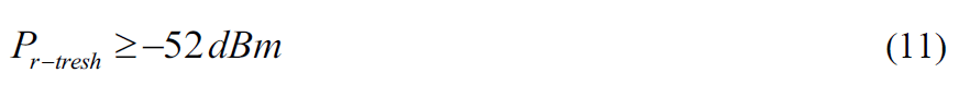The received power threshold Pr-thresh is defined by assessing the noise at the receiver. While the thermal noise threshold equals to 99 dBm, the receiver noise factor is 17 dB and the SNR required is at least 30 dB in order to receive the signal without errors [28], for efficient reception, the minimum received power Pr-thresh required for successful reception is:
