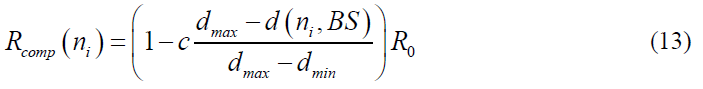 Each sensor node calculates its competition range (Rcomp) which is determined according to the relative value of the distance between the sensors and the BS. Based on this distance, the network will produce clusters of different sizes. The Rcomp for an arbitrary node ni is given by: