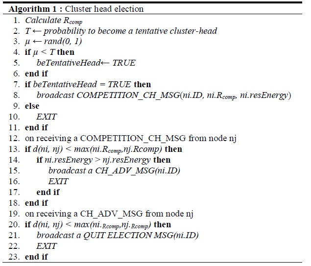 Each node generates a random number that is greater than 0 and less than 1, if the number generated is below the threshold T (approximate percentage of the desired tentative CH), the node becomes a tentative CH. Afterward, the CH competition begins. Every tentative CH sends a message “COMPETITION_CH_MSG” to its surrounding tentative CHs within its maximum competition radius, the message includes the node ID, residual energy and competition radius. If a tentative CH thi receives a “COMPETITION_CH_MSG” from the node thj, which is within its competition radius, and the residual energy of thi is greater than that of thj, thj gives up the CH competition and broadcast a message “QUIT_CH_MSG”. Then if thi has the highest residual energy among the tentative CHs within its competition radius, it becomes a CH.