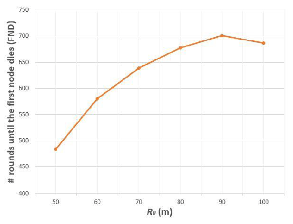 To verify the relationship between c and the longevity of the network, we vary the value of c from 0 to 1 (Figure 4). In the case where R0 is set at 90 m and c is increasing from 0. The effect of varying c value becomes distinct. However, the network lifetime increases with the rise of c until a value equals to 0.6, after that the network lifetime decrease when the value of c is too high. In fact, when c equals 0, the algorithm generates clusters of equal size, and when c is greater than 0 the size of clusters varies which generates more clusters. Each cluster must provide a data packet to the BS, with a high number of clusters, the network consumes more energy in inter-cluster communication, causing energy dissipation. Consequently, there is an appropriate value of c if R0 is specified to obtain an adequate number of clusters that is approximately 0.4 in this case as shown in Figure 4. In addition, the effect of varying R0 on network longevity is investigated in Figure 5. The result shows that R0 significantly affects the durability of the network.