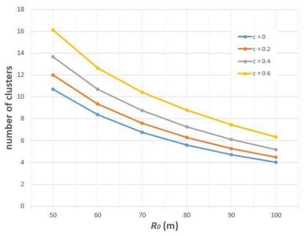 All CHs are in charge of aggregating the data of their members into a single packet, and each cluster sends its packet to the BS. Therefore, if there are more clusters, more messages must be transmitted to the BS, the large number of clusters leads to an increase in overall energy consumption. Based on the defined c and R0, there is a variation in the selected number of CHs. The mean number of CHs produced is shown in Figures. 6 and 7. When R0 is given and the value of c goes from 0 to 1, the radius of competition reduced consequently, and further clusters are generated as shown in Figure 6. When the value of c is set and the value of R0 increases, the number of clusters decreases, as shown in Figure 7. With a small competition radius, the network should produce more clusters to cover the network.