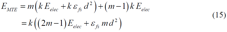 If the minimum distance between a source node and its CH is by one hop, the source node transmits its data directly to the CH. Otherwise; the source node adopts the MTE algorithm to transmit the data to the CH with several minimum hops. The nodes have then to perform m transmissions within a distance of d and m-1 receptions. In each cluster, the amount of energy consumed for reception and transmission in MTE mode is expressed by: