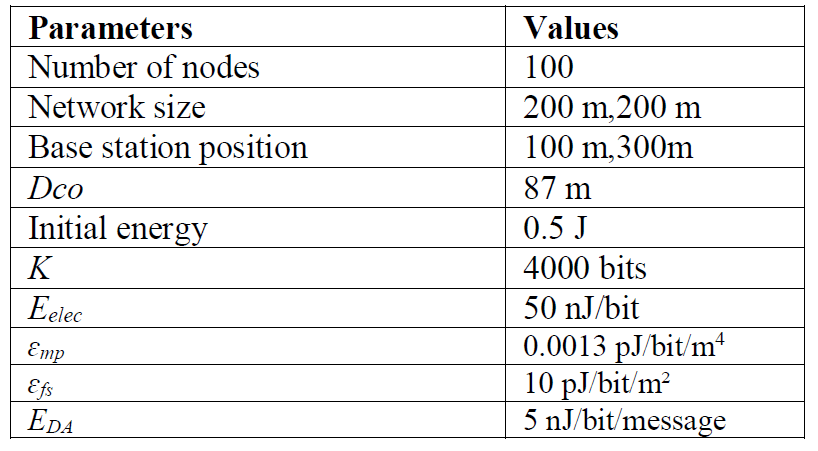 The sensors are randomly distributed over a 200 m x 200 m area; there is only one BS, located at (100 m, 300 m). We set the threshold T to 0.4, R0 to 90 m, and c to 0.4 in equation (13). These values are estimated through the performed analysis and simulations (Figure3). Table I presents the parameters used for the simulations of the proposed model.