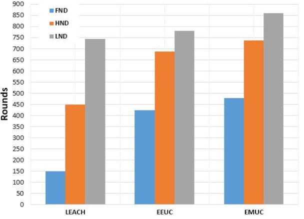 Figure 8. Lifetime metrics (FND, HND and LND) for LEACH, EEUC, and EMUC