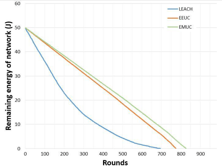 Figure 10 shows the total system energy as a function of rounds for LEACH, EEUC, and EMUC. The balance of energy consumption in the network is influenced by the energy consumed at each round. Therefore, the energy consumed per round should be balanced in order to maximize the network lifetime. Due to the fact that EMUC balances the energy consumption between CHs and nodes, the durability of the EMUC network is extended and lasts longer than the LEACH and EEUC protocols. In addition, EMUC improves the reliability of transmission in the clustering process. In this case, the minimization of inter-nodes distance ensures that the transmission inside the clusters is mostly free space propagation. Using this propagation model, the energy efficiency of the network is effectively increased.
