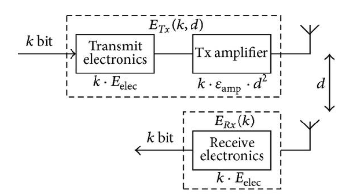 We assume that the sensor consumes energy during data transmission and reception. In transmission, the node consumes energy to operate the radio electronics and the power amplifier. However, in reception, the node consumes energy to operate the radio electronics. Thereby, the energy consumption for transmitting a message of size k-bits over a distance d, is defined by: