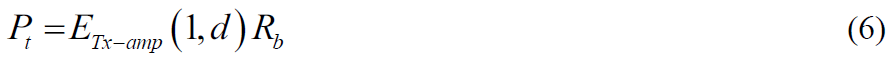 The ɛfs and ɛmp parameters vary depending on the sensitivity required of the receiver and the receiver noise factor, as the transmit power should be adjusted so that the receiver power is above a certain threshold Pr-thresh. The transmit power Pt corresponds to the transmit energy per bit ETx-amp(1, d) multiplied by the radio bit rate Rb: