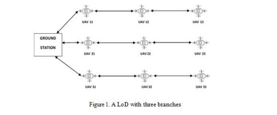 As mentioned in the above section, an LoD network is a network with several UAVs. An LoD has a star-connected relay topology, where the ground station is at the headend and all UAVs are located in the branches [3]. A simple LoD is shown in Figure 1. Each UAV in this network has the capability to communicate with its neighbor UAVs in the same branch. The distance between two UAVs in any two different branches of an LoD is larger than the maximum Wi-Fi coverage distance of 100m, except in the case where the branches are made to be closer to improve reliability [4].