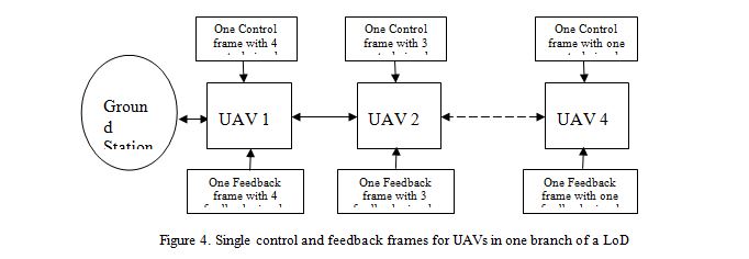 We used only four UAVs in a branch in this LoD network with this new signaling mechanism. However, in an LoD network with more than four UAVs in a branch, these single control, and feedback frame signaling mechanisms can still be used. If the network has more than four UAVs in a branch, a ground station will send one control frame for every four UAVs and receive one feedback frame from those four UAVs. For example, if a branch has eight UAVs, the ground station will send two control frames to first UAV, one for first four UAVs and the other for the last four UAVs. The ground station will receive two feedback frames, one from the first four UAVs and the other from the second 4 UAVs. Each one of these feedback frame has the feedback information of four UAVs.