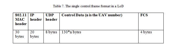 In a LoD network, the ground station can create a single control frame for 4 UAVs in a branch. This frame has a payload of 130*4= 520 bytes. This single frame also has 8 bytes UDP header, 20 bytes IP header, 30 bytes 802.11 MAC header and 4 bytes FCS as shown in Table 7. UAV 1 will receive a single frame of 582 bytes. UAV 1 processes this frame, extracts its control command and repacks the remaining data into a new frame before sending it to UAV 2. Now, UAV 2 decapsulates the frame to extract its control command. This process repeats at each UAV and continues until the last UAV (UAV 4) receives its control command as shown in Figure 4.