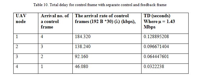 Table 11 shows the queuing and processing delay calculation for a feedback frame for the separate control and feedback signaling in the LoD network. We found the number of feedback frames arriving at each UAV and calculated the arrival rate of feedback frames.