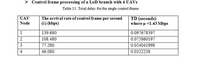 We found the total delay at each UAV node in the LoD network with the help of Tables 10 and 11. The total delay calculation is shown in Table 12. We also calculated the delay from the ground station to each UAV node as shown in Table 12.