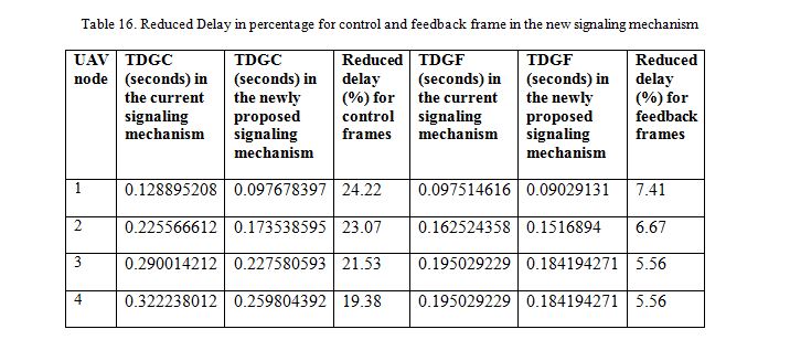 We calculated the delay from each UAV node to the ground station for both types of signaling mechanisms in the last section. Table 12 shows the delay for the current signaling mechanism, where separate feedback and control frame is used for each UAV and the delay for the single control and feedback signaling mechanism in Table 15. The delay comparison graph shown in Figure 6 was drawn with the help of Table 12 and 15. We can see from the graph that our newly developed single control and feedback frame mechanism has a lower delay compared to the existing signaling method. The reduction in delay as a percentage with the new signaling mechanism is presented in Table 16.