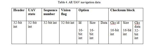 Table 4 provides information about the navdata that is transmitted from the AR 2.0 UAV to the ground station. UDP port 5554 is used to send the navdata from the UAV to the ground controller. This navigation data is received periodically (less than 5ms) by the client application and it has various information such as flight speed, altitude, distance, roll, pitch, camera, and much more. Each UAV sends this information in a single UDP packet. As shown in Table 4, standard navdata has 4-byte header, 4-byte UAV state, 4-byte sequence number, 4 bytes for tag vision, and 4 bytes for the checksum data in the checksum block. The navdata information is stored in several options fields in a UDP packet. Each option field has a 2-byte header, a 16-bit integer for the size of a block, and a data block. These fields are used to specify what type of navigation data is received by the ground station. The information in options fields is stored in the form of a 32-bit integer and 32-bit single-precision floating-point number or arrays. As in the control frame, the feedback frame also contains 4 bytes of a checksum at the end of the frame.