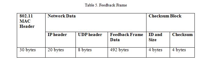 Wireshark showed that each feedback frame has 492 bytes of feedback data and when we use the standard MAC header the size of the feedback frame will be 558 bytes. The feedback frame that is transmitted from the AR 2.0 UAV to the ground station is shown in Table 5.