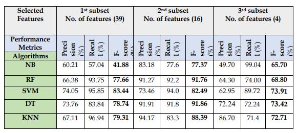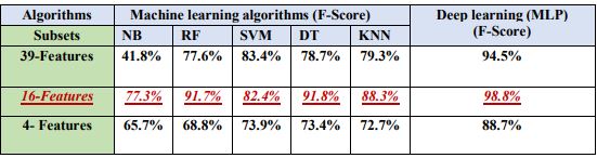 From our three experiment we have best and worst way. If we used all dataset features without feature selection techniques, we prefer using SVM algorithm which had a higher accuracy than other machine learning algorithms with (83.44%). If we use all dataset features with deep learning algorithm (MLP), we got better accuracy than using machine learning algorithms with (94.5%). If we used [16-feature] subset after applying features reduction techniques, we prefer using machine learning algorithms (RF) with accuracy (91.76%) and (DT) with accuracy (91.86%). When we selected genes from [16-feature] subset we get high accuracy than using all feature content with (94.76%) using machine learning algorithms. If we use [16-feature] subset with deep learning approaches, we got a higher accuracy (98.81%) with (MLP) technique. If we use [4-feature] subset with (MLP) deep learning technique we got higher accuracy (88.7%) than using machine learning algorithms with accuracy (73.9%). We notice that [16-feature] subset which has been chosen based on frequency between features and attacks has the high results in three experiments. Finally, we have bad precision if we use all the features in our dataset without feature selection. If we used 4-features also get bad accuracy because we do not make any feature selection methods, we just get it as a common feature from previous researches. When using selection methods with 16-attributes, we are more precise. Feature selection is considered a very important step before classification. Using Multi-layer perceptron deep learning technique got higher accuracy in all three experiments with all subsets.
