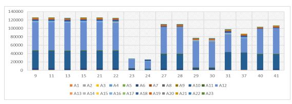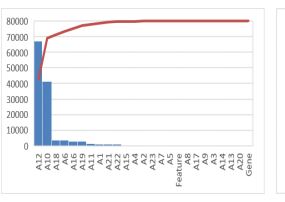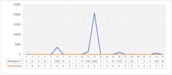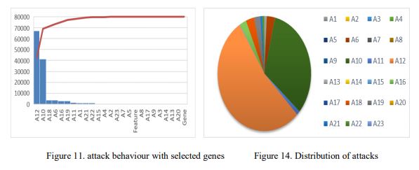 For example, feature number 23 which named (count) has 512 gene. We convert all 23 attack types to (A1,A2,…….A23) as shown in table (7), after obtaining frequency between these genes and attacks we found that only gene (1) in feature 23 has a higher attack detection. We will do that for all 16 features in our subset. The results are appeared in table (9). Figure (12) shows the distribution of gene 1 in feature23. Figures (11.13.14) display the Attacks behaviour with selected genes.