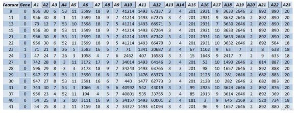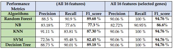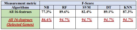 Table 13. Comparison of F-score between 16 features (before & after deleted genes)