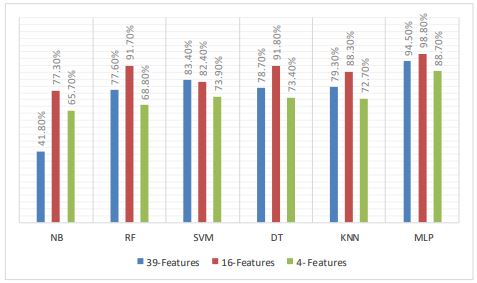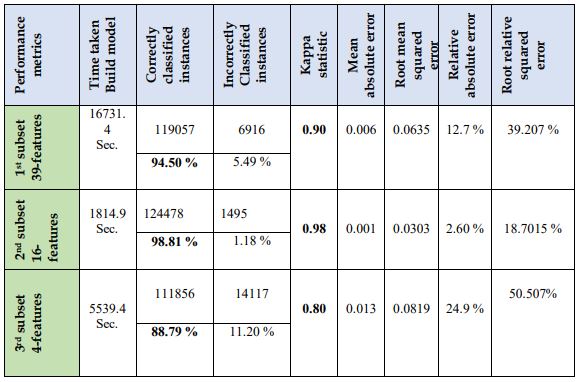 In this experiment deep learning has been used through classification step by multi-layer perceptron (MLP). We performed this experiment with our three subsets (39-Feature, 16-Feature, 4-Features) and differentiate between the results. MLP used for training a supervised learning method called back-propagation. MLP is distinguished from a linear perceptron by several layers and non-linear activation. Data that cannot be linearly separated can be distinguished by MLP [33]. A total number of instances in all subsets is 125973 instances.