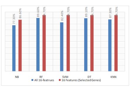 In the 2nd experiment we feed our model with training set and for testing, we split the training data into 70 % for training and 30 % for testing to measure the accuracy in a good way. We used same algorithms in classification as 1st experiment. The results show that selected genes have accurate results than those in all 16-features. That is confirmation that not all feature content is important in attack detection as shown in table 10.