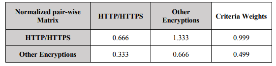 After calculating Weighted Sum Value (WSV), based on the aforementioned explanation, we measure the Consistency Ratio, (CR = CI/RI = 0.06479), which is less than 0.1 to prove that the matrix is reasonably consistent. We repeat all steps of CW calculation that we have accomplished for sub-factors of “Monitoring and Logging” to calculate the weights of sub-factors in Encryption”. The “Encryption” factor comprises two security sub-factors of “HTTP/HTTPS” and “Other Encryptions”. After repeating the previous steps we obtained CW as follows in Table 4: