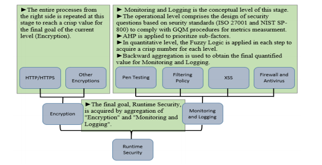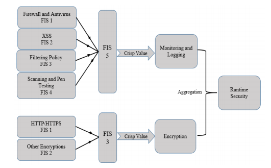 primary reason for this type of classification is that the answers of the questionnaire are in the format of “very low”, “low”, “medium”, “high” and “very high”. The weights in the interval of [0-10] are assigned to each sub-factor in the questionnaire. In other words, this way of linguistic variable-description to evaluate the answers determines what fuzzy subset from “very low” to “very high” each sub-factor belongs to. As shown in Figure 6 all weights obtained from AHP are assigned to each sub-factor to contribute to the security of predecessors as shown in Figure 7. Furthermore, Figure 7 depicts the main factor “Runtime Security” that comprises four Groups:(1) two groups belong to “Monitoring and Logging” factor which is the result of interior FIS attributes such as “Firewall and Antivirus”, “XSS”, “Filtering Policy” and “Scanning and Pen Testing” (2) two groups belong to “Encryption” factor which is the result of interior FIS layer “Encryption” such as “HTTP/HTTPS” and “Other Encryptions”.