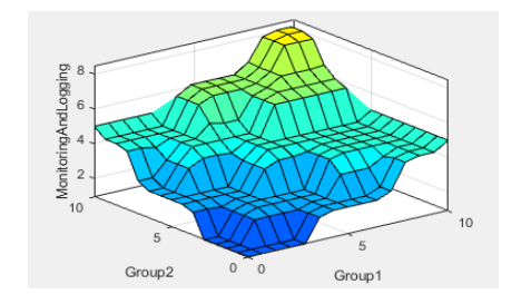 As shown in figure 9 there is a smooth output (not flat plateaus) which indicates the general incremental trend illustrating that we do not have many input combinations that produce the same output. This figure shows the maximum value of “Monitoring and Logging” happens at the peak value of the intersection of Group1 and Group2. This is the best evidence to show how the vulnerability measurements in different inputs are distinguished.