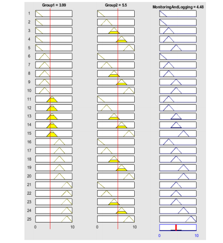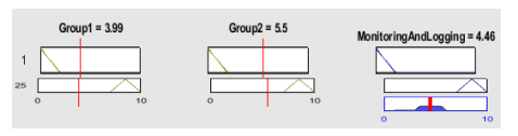 As shown in Figure 11 the MFL is applied to the same groups as Figure 10 but in this measurement process, all fuzzy rules have the same weight 1. The output for the security of “Monitoring and Logging” is 4.46 that quantify the vulnerability with the value 5.54.