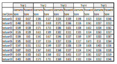 The result shows that the most efficient threshold is 0.56 with the most minimum equal rate which is 7.176%. The test is also done on the actual system by setting a similar situation as the simulation test. 10 sets of scores from 5 different users (testuser01- testuser10) are collected and the results show that the Username average score is 0.554 and the Password average score is 0.579. The details results are shown in Table 2.