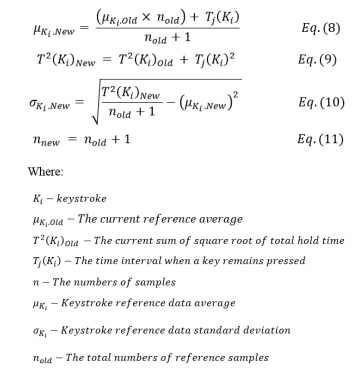 In creating the new reference variable, an algorithm known as a retraining algorithm is used. Therefore, the new variables can be calculated by going through line by line in the user reference template. However, as the template is growing each time the user successfully login, the performance of the system will slow down as there is more data that need to be processed. Thus, new formulas to improve the processing time on calculating the new reference variables were derived by utilizing the current reference variables as presented in Eq. (8) to Eq. (11).