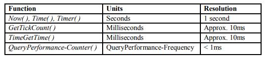 Table 1 shows, API Now(), Time(), Timer(), GetTickCount() and TimeGetTime() have a minimum resolution up to 10 milliseconds, and QueryPerformanceCounter() has minimum resolution below 10 milliseconds. QueryPerformanceCounter() will able to update between each successive API call which is useful in high-resolution timing compared to other Windows APIs in which the update depends on the background tasks executed by the system.