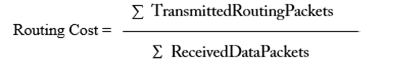 RoutingCost is the amount of information in the network required to receive a packet of data. It is calculated based on the number of bytes for routing packets, including the transmission of routing packets and control packets, divided by the sum of the number of received data packets.It is calculated as follows: