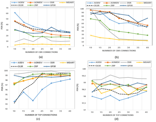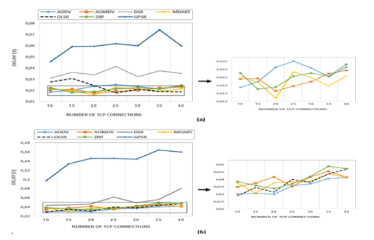 Figures 6a and 6b show that the best results are obtained with the reactive protocols (AODV and AOMDV), since these have the capacity to maintain the route when sending data. From the same figure, we can see that the use of RSUs leads to a higher PDR for the routing protocol in Figure 6b than in Figure 6a. A lower rate is seen for the DSR protocol in the scenario without RSUs, since as mentioned in Section 2; it is unable to repair broken links locally. Better performance is achieved for communication between RSUs and vehicles for a low number of CBR connections. DSR uses an alternative route, as it can store more than one path in the cache. In addition, the GPSR protocol achieves better performance than the other two protocols, due to its routing method, which involves finding the neighbour with the lowest distance to the destination and accurate location information, which is an important factor in achieving a high PDR. The proactive protocol MDART achieves a lower performance than the reactive protocols in both scenarios (with and without RSUs), as the congestion caused by broadcasting RREQ packets may lead to loss of packets. OLSR is the best option, since it can reduce the retransmission of data packets and maintain the best possible path, thus reducing the congestion and the overload. MDART achieved the weakest results, showing a significant decline and then stabilization as a function of CBR connections. In scenarios with RSUs, the proactive protocols obtained a higher PDR than in scenarios without RSUs. The OLSR protocol achieved 85% for a low number of connections, and 49% for 40 connections, while the hybrid protocol ZRP decreased progressively in both scenarios and is an inefficient choice for a highly dynamic topology such as a VANET.