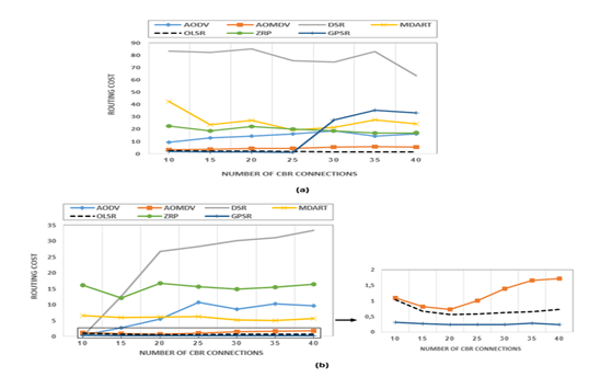 The routing costs for the seven protocols for both modes of communication as a function of CBR data traffic load are shown in Figure 10a and b. The routing costs for the various protocols remain almost stable for the two scenarios, since if we increase the number of CBR connections between nodes, the number of control packets remains almost the same. The routing protocols in the scenario with RSUs have a cost that is lower than 35 packets. GPSR, AODV, AOMDV, MDART and OLSR have low overheads, since they do not generate additional RREQ and RREP packets in the network. DSR has the highest cost in both scenarios, followed by the ZRP hybrid protocol.