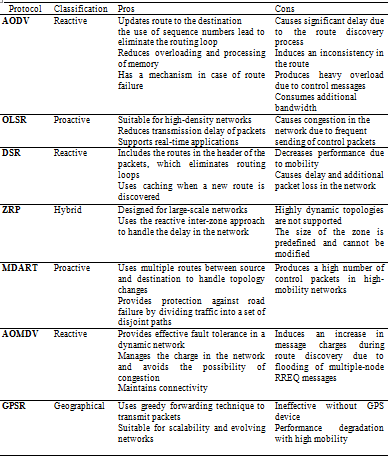 In the following paragraphs, we discuss the operating mechanism of routing protocols, the cons and the pros of each one. All protocols are listed with their main advantages and disadvantages in Table 1.