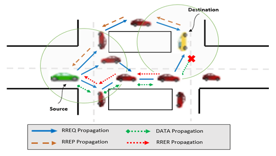 Ad-hoc on-demand distance vector (AODV) [9] is a protocol that uses an on-demand algorithm from Bellman-Ford. When a source node wants to send a packet, it determines an end-to-end route to a destination. The AODV protocol has two well-defined mechanisms: discovery of routes, and maintenance of routes. Route discovery occurs when there is no route to the destination, while route maintenance is responsible for maintaining the route between the source and the destination. The reactive protocol AODV is shown to be suitable for both high and low densities of vehicles in [10], [11].
