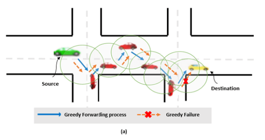 Figure 5. An exemplary of GPSR functionality: (a) Greedy process and greedy failure